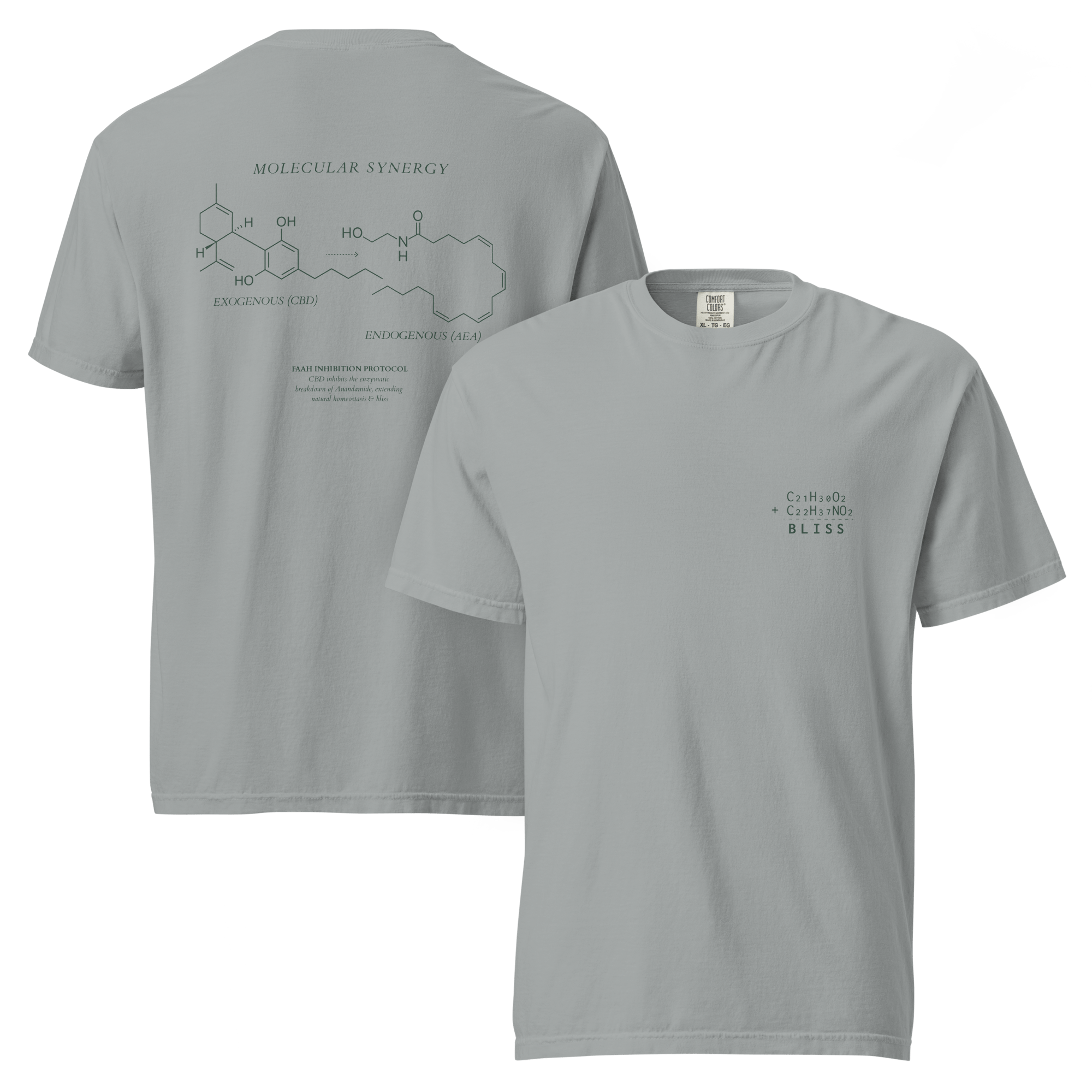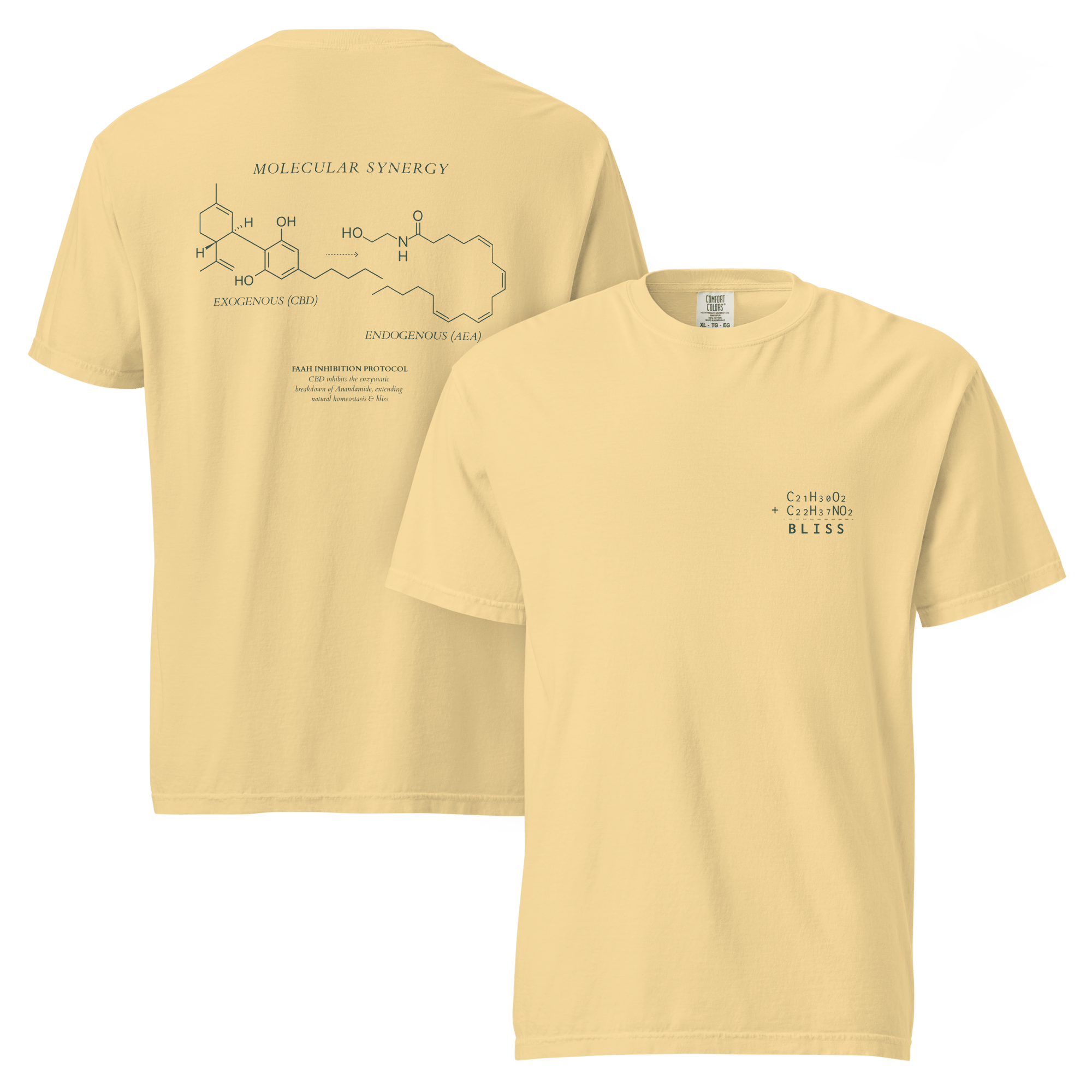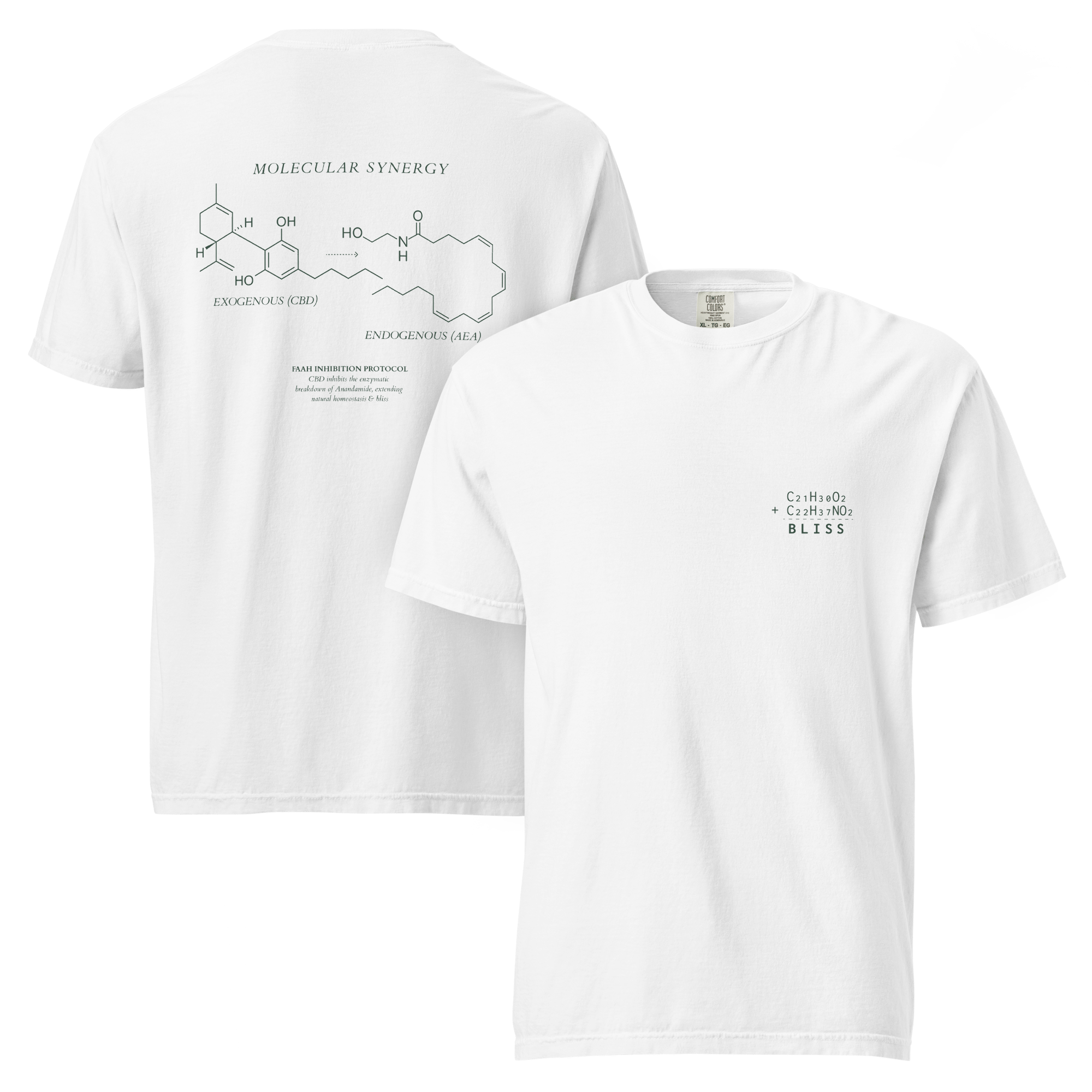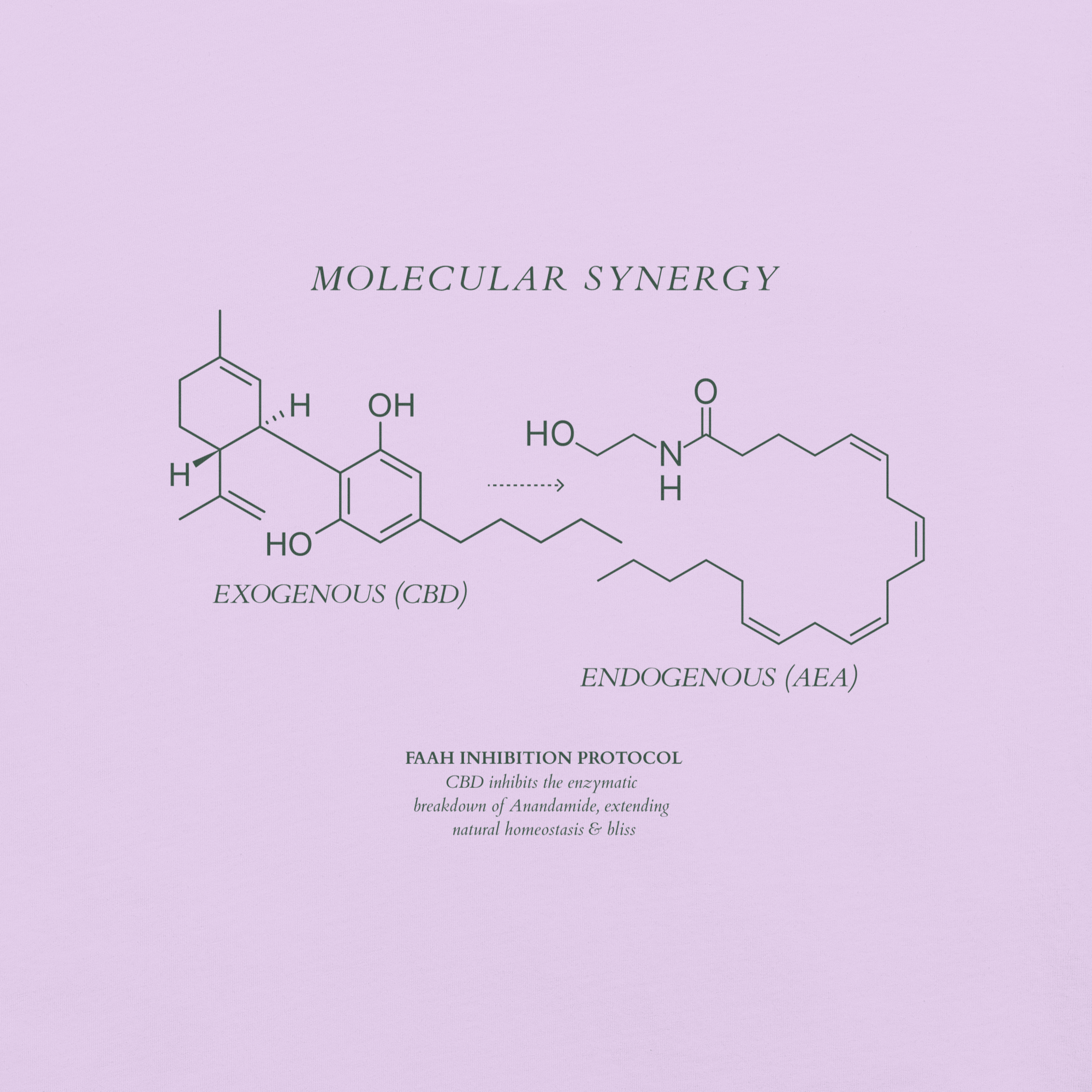 This design illustrates the biological synergy between CBD (C21H30O2) and Anandamide (C22H37NO2). CBD acts as a guardian, inhibiting the enzymes that break down your natural bliss molecules—keeping your system balanced, calm, and elevated for longer.